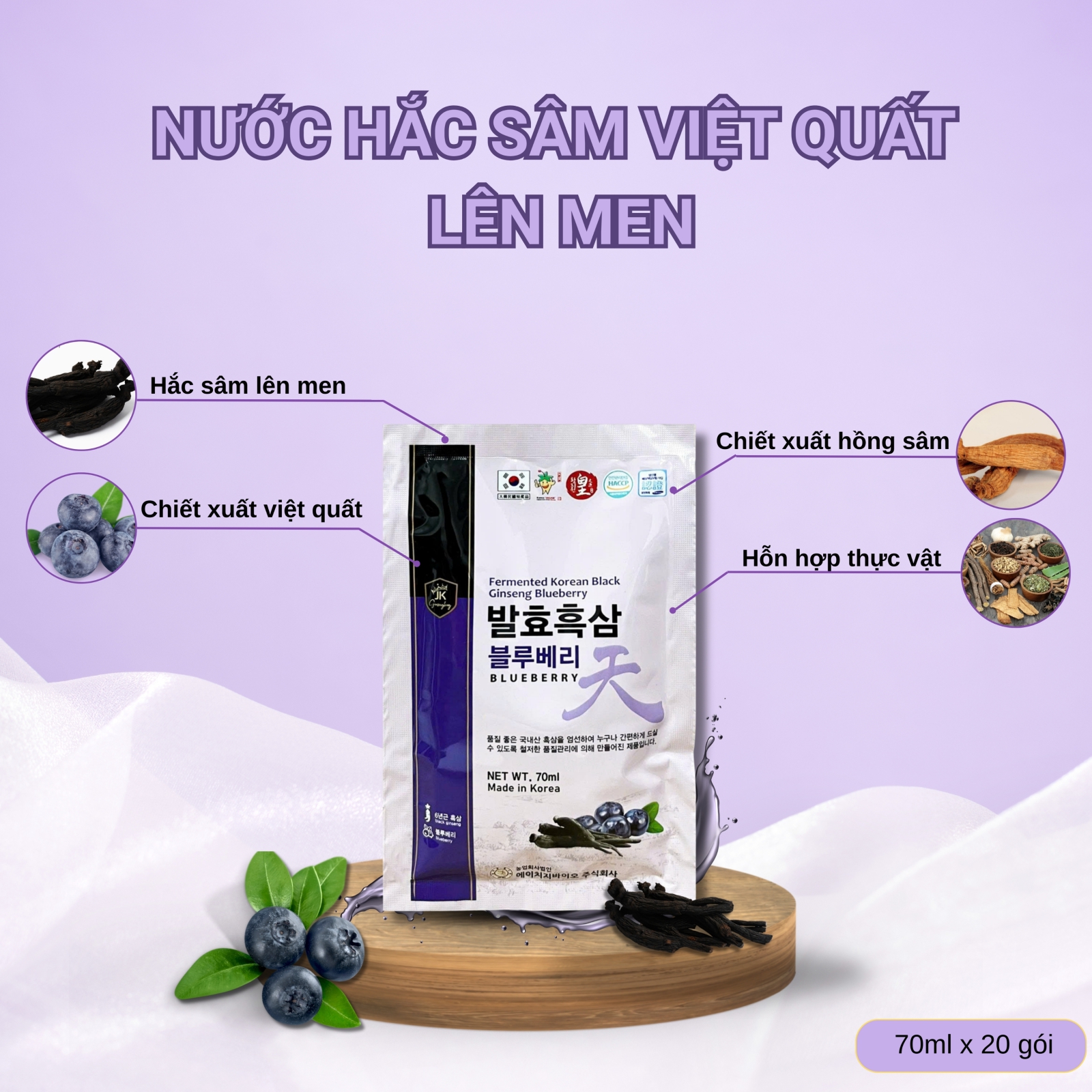 Nước Hắc Sâm Việt Quất Lên Men (Fermented Korean Black Ginseng Blueberry) là giải pháp chăm sóc sức khỏe chủ động đột phá, kết hợp tinh túy từ hắc sâm lên men hàm lượng Saponin cao và "siêu thực phẩm" việt quất tươi giàu Anthocyanin. Nhờ ứng dụng công nghệ lên men sinh học hiện đại, sản phẩm giúp bẻ gãy các liên kết hóa học phức tạp thành các phân tử siêu nhỏ, giúp cơ thể hấp thụ dưỡng chất nhanh chóng và triệt để hơn so với các dòng sâm truyền thống. Đây không chỉ là thức uống phục hồi năng lượng tức thì cho người bận rộn mà còn là liệu pháp "vàng" giúp trẻ hóa làn da, bảo vệ thị lực và duy trì phong độ rạng rỡ từ sâu bên trong tế bào.