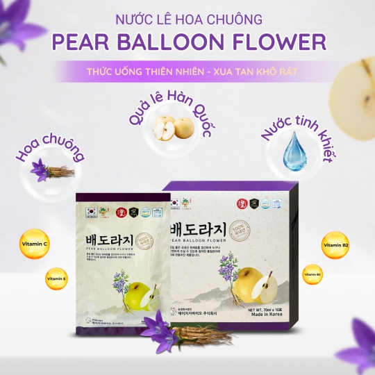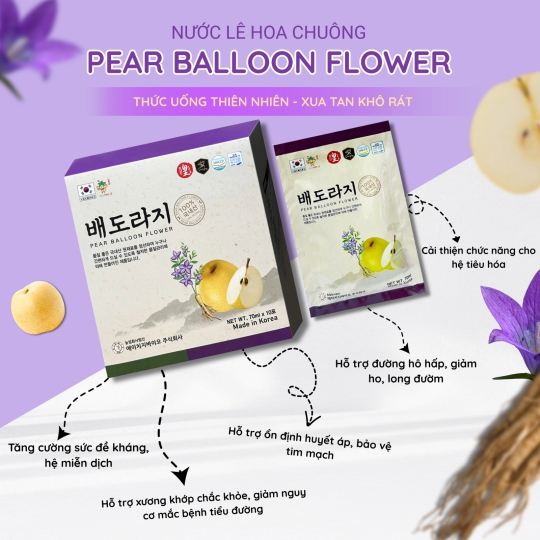 Bạn đang lo lắng về những cơn ho kéo dài dai dẳng hay cảm giác khô rát họng khó chịu mỗi khi thời tiết thay đổi? Hãy để Nước Lê Hoa Chuông (Pear Balloon Flower) – thức uống tinh túy từ xứ sở Kim Chi – chăm sóc và bảo vệ sức khỏe cho cả gia đình bạn một cách toàn diện nhất.