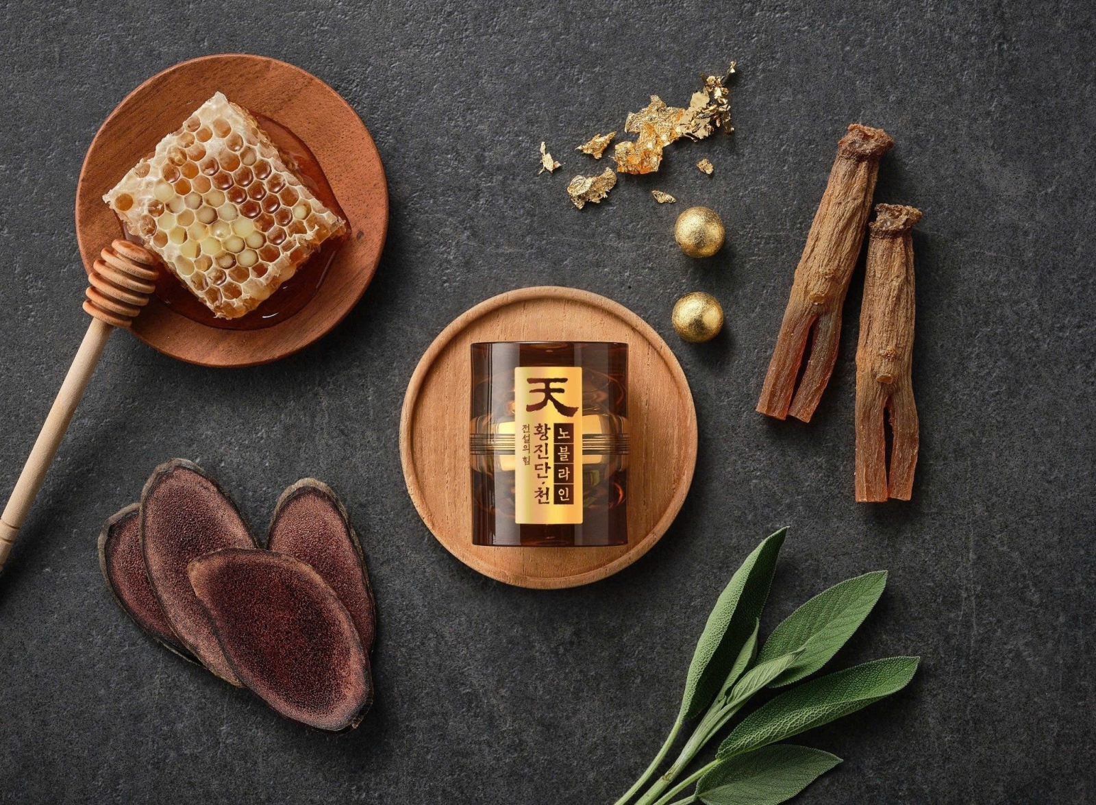 Sự đắt đỏ và quý hiếm của Thiên sâm linh đan KGC Hwang Jin Dan Cheon Noble Line đến từ bảng thành phần "vàng" theo đúng nghĩa đen và nghĩa bóng. Thành phần Thiên sâm cao cấp chiếm tới 38,33%, kết hợp cùng Nhung hươu New Zealand thượng hạng (0,75mg/viên) giúp bồi bổ tủy xương và tăng cường sức mạnh cơ bắp. Đặc biệt, sự xuất hiện của Vàng lá 8,5% bao phủ toàn bộ viên linh đan tạo nên một vẻ đẹp tinh tế, biến mỗi viên sâm thành một viên ngọc quý. Ngoài ra, sự góp mặt của rễ Bạch chỉ, cây Xô thơm tự nhiên và Sữa ong chúa càng làm tăng thêm dược tính chống lão hóa, giúp làn da hồng hào và kéo dài tuổi thọ cho người sử dụng.